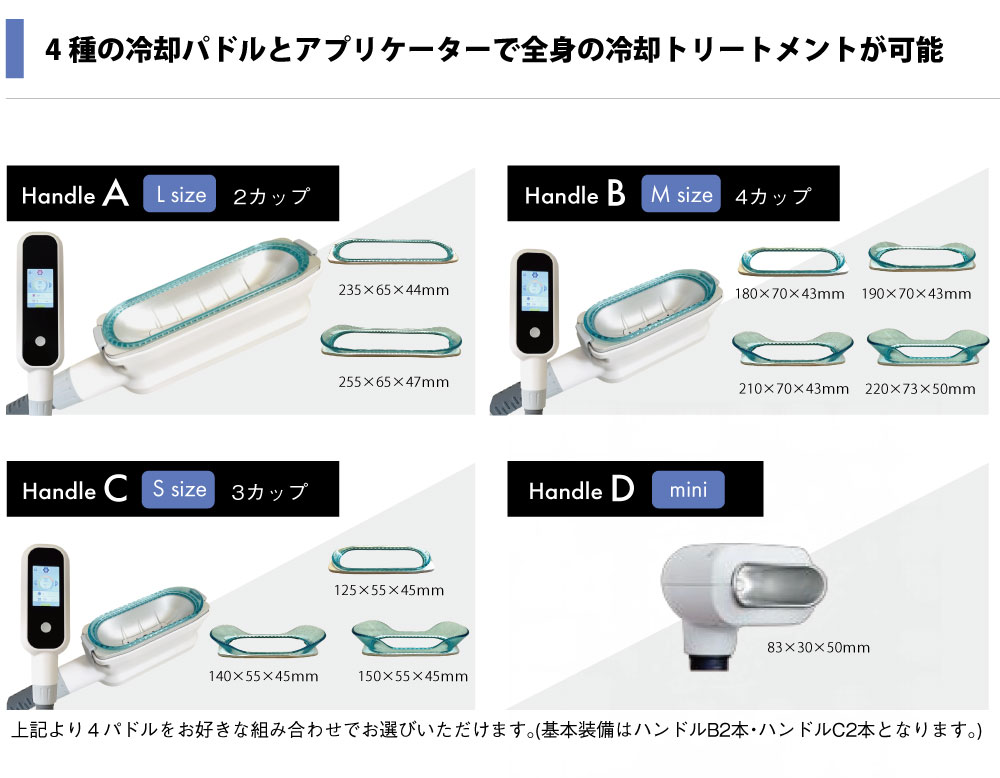 360°冷却カップが4つ付属、4部位同時稼働が可能の最新脂肪冷却痩身機です。脂肪の厚みに合わせ、温度・時間が5パターン設定されており数値に迷わず施術ができます。大画面タッチパネルで楽々操作、各パドルの液晶でも設定が可能です。